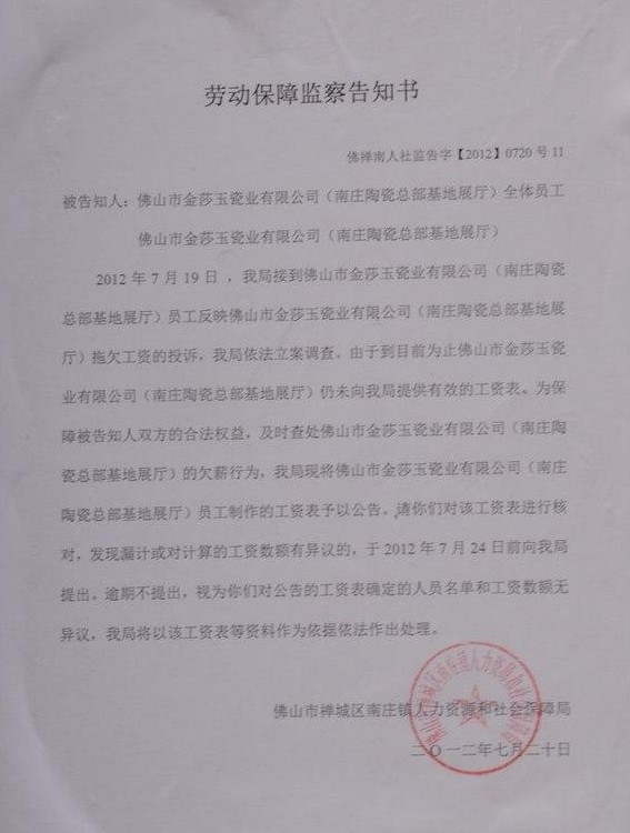 从张贴出来的《劳动保障监察告知书》上,记者得悉,原来是佛山禅城区南庄镇人力资源和社会保障局人员接到金莎玉员工拖欠工资的投诉,经立案调查后至今仍未接到该公司的任何相关回应从而从而对其下达检查告知书,物业公司也按照相关规定对其展厅大楼进行查封。