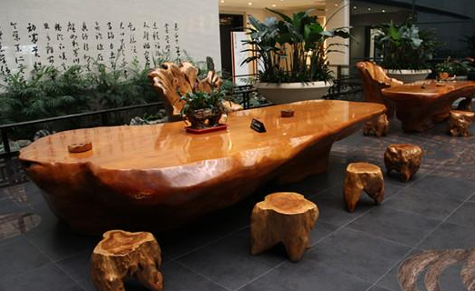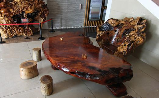 新明珠陶瓷展厅内的根雕桌椅