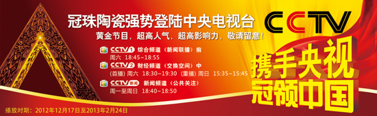 与此同时新明珠陶瓷集团其它多个品牌今年亦将加大专卖店、大店建设步伐,全面提升集团综合市场竞争力!特别是冠珠陶瓷在质量口碑、品牌美誉度、消费者口碑方面已有不错的影响力,这次冠珠陶瓷重磅登陆央视众多知名栏目,势必迅速影响到全国各个终端渠道,令“冠珠造•好瓷砖”的理念深深扎根在每一位消费者心中。众所周知,央视在消费者心目中都有着很强的影响力和公信力,历来都是各大企业最注重的品牌推广资源。在央视上做广告,不仅是实力的象征,更是出色的营销策划的表现。由于每个企业自身定位的不同,选择频道、栏目、时段以及播放频次的不同,所带来的效果也会有所不同。冠珠陶瓷采取高收视、高频次、多时段、强势覆盖收视人群、强化传播力度的投放策略,选择在《新闻联播》、《交换空间》等栏目投放广告,正是因为收看群体都是白领高端人士,与冠珠中高端品牌定位非常吻合,对传递冠珠品牌价值有重大的推动作用。