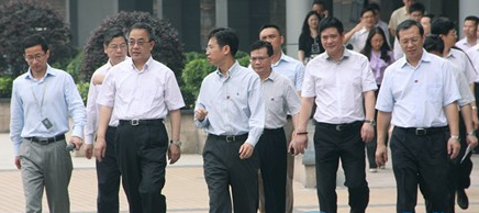 胡书记(左前二)一行在佛山市市委书记李贻伟(右一)、佛山市委常委、禅城区委书记区邦敏(左前三)、佛山中国陶瓷城发展有限公司副董事长叶仙斌(右二)、中国陶瓷城、中国陶瓷产业总部基地执行董事、华夏中央广场总经理周军(左一)等领导的陪同下考察佛山陶瓷
