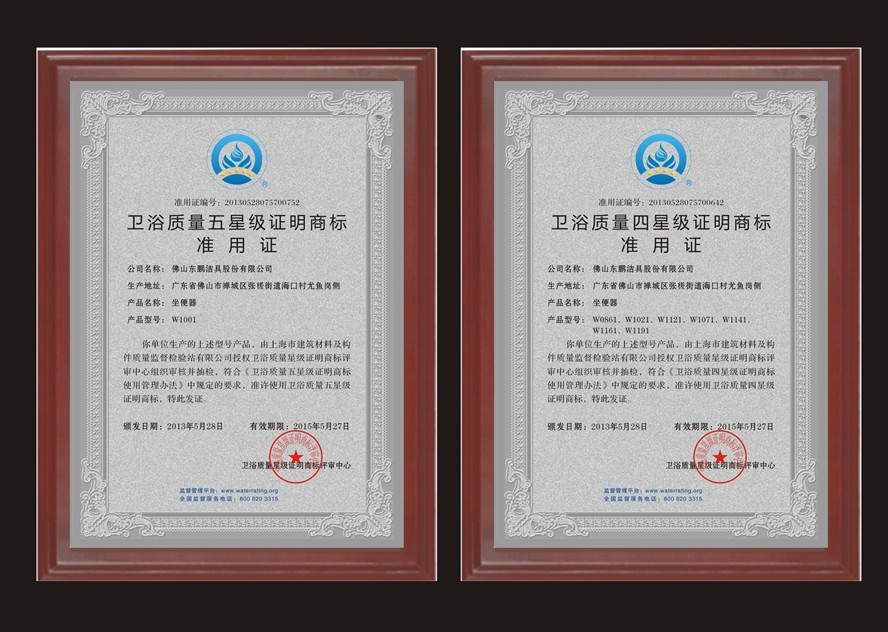 东鹏洁具此次参与评选的产品,包括节水王、易洁釉、奥斯卡,3大系列中的8个型号的座便器,均通过了检测机构严格的安全性能、卫生性能和用水效率等级综合测评,达到这项业内首次出台的产品星级评价标准。其中,节水王系列W1001座便器,荣获卫浴质量五星级证明商标,W0861、W1021、W1121、W1141、W1161等多款座便器获得卫浴质量四星级证明商标。目前在陶瓷卫浴企业中只有少部分卫浴企业的产品获得此认证,各项产品指标分别符合国际标准,标志着东鹏洁具步入国际先进陶瓷卫浴生产的企业之列。