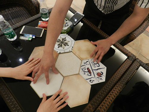 任江告诉记者,小蜜蜂陶瓷主推的六边形仿古砖,将以蜂巢的模式进行组合应用。他一边演示如何将几块六边形砖拼成一个“蜂巢”,一边解释“蜂巢”概念。据介绍,“蜂巢”有一种甜蜜的感觉,又有家的感觉,与经销商的合作,可以看作是小蜜蜂陶瓷建立了一个又一个窝。而小蜜蜂陶瓷现有的200多个专卖店,未来一到两年都将统一形象,建成独具特色的“蜂巢美学馆”,让设计师们可以在其中感受“玩原创,玩设计,玩水平”的氛围。