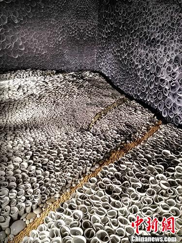 记者在现场看到,朱乐耕本次展出的作品均为陶瓷艺术品。但形式不尽相同,有的作品摆在桌上,有的挂在墙上,有的则铺满在地上。